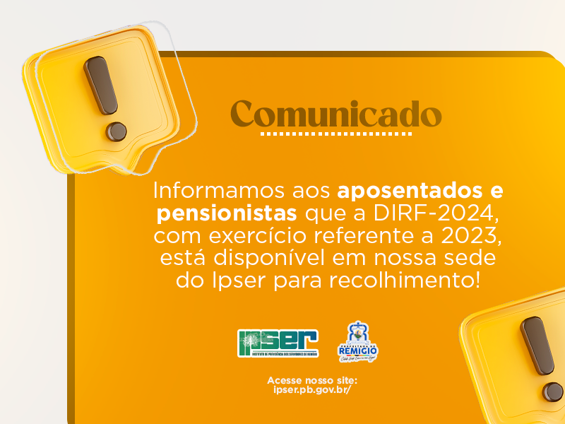Informamos aos aposentados e pensionistas que a DIRF-2024, com exercício referente a 2023, está disponível em nossa sede do Ipser para recolhimento!