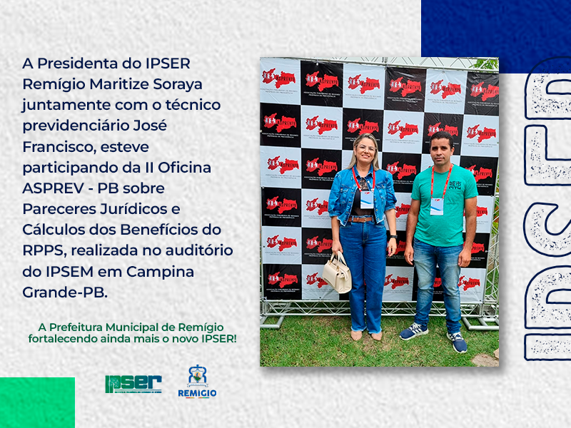 A Presidenta do IPSER Remígio Maritize Soraya juntamente com o técnico previdenciário José Francisco, esteve participando da II Oficina ASPREV - PB sobre Pareceres Jurídicos e Cálculos dos Benefícios do RPPS, realizada no auditório do IPSEM em Campina Grande-PB.